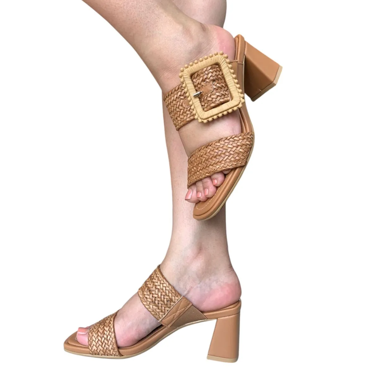 • Cabedal: Trama trançada com um delicado detalhe de fivela, proporcionando um visual elegante e feminino.