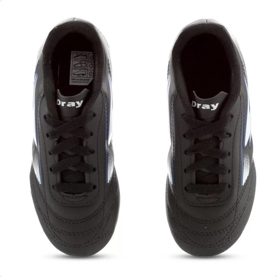 A Chuteira Dray Campo 324 tem o cabedal em material sintético e PVC laminado. Com forro interno revestido de espuma, e ajuste em cadarço, possui palmilha em PU para maior conforto e um solado em borracha para prática em futebol.
