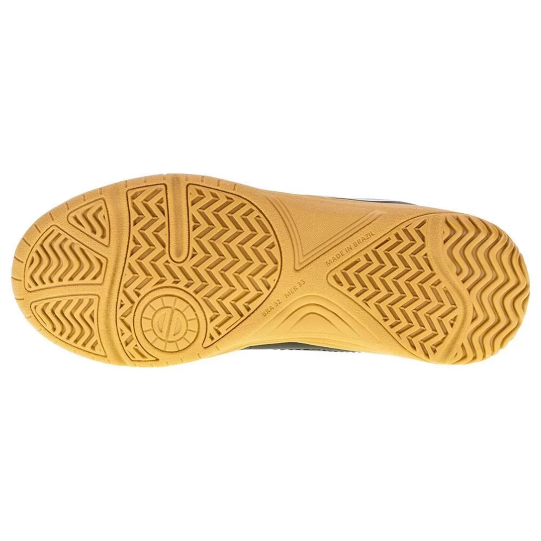 A Chuteira Infantil Indoor Spedy Dray é confeccionada em PVC laminado de alta qualidade com acabamento em costura, fechamento por cadarço de amarração, forro interno em têxtil, palmilha em EVA e solado em borracha antiderrapante.