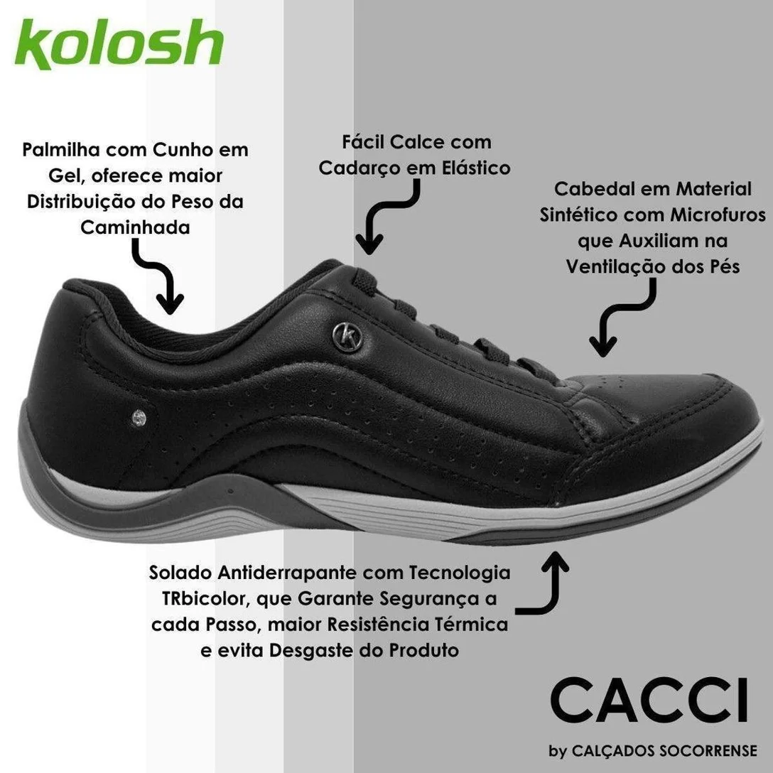 O design minimalista do Tênis Kolosh Casual destaca as costuras, formando volumes com toque fofinho nas laterais, assim como os microfuros, que auxiliam na melhor respirabilidade do pé. Ainda conta com um strass aplicado na lateral, trazendo um toque delicado ao modelo. O calce fácil se dá pelo elástico, que proporciona um perfeito ajuste no pé, além de otimizar tempo de calce. O tênis ainda conta com a palmilha em gel, que garante absorção de impacto, além de atuar na redistribuição de peso e auxiliar na postura corporal. Além disso, a sola em TRbicolor antiderrapante, projetada para a maior aderência e segurança na pisada, traz também maior resistência térmica e menor desgaste.