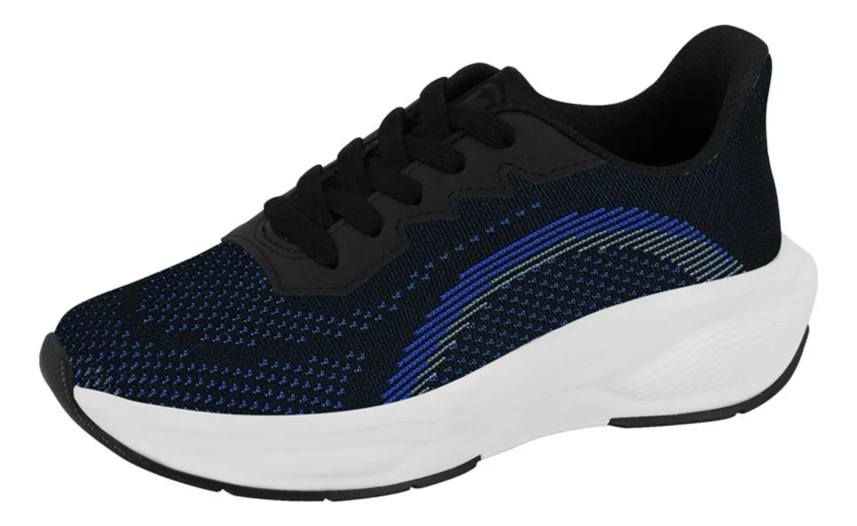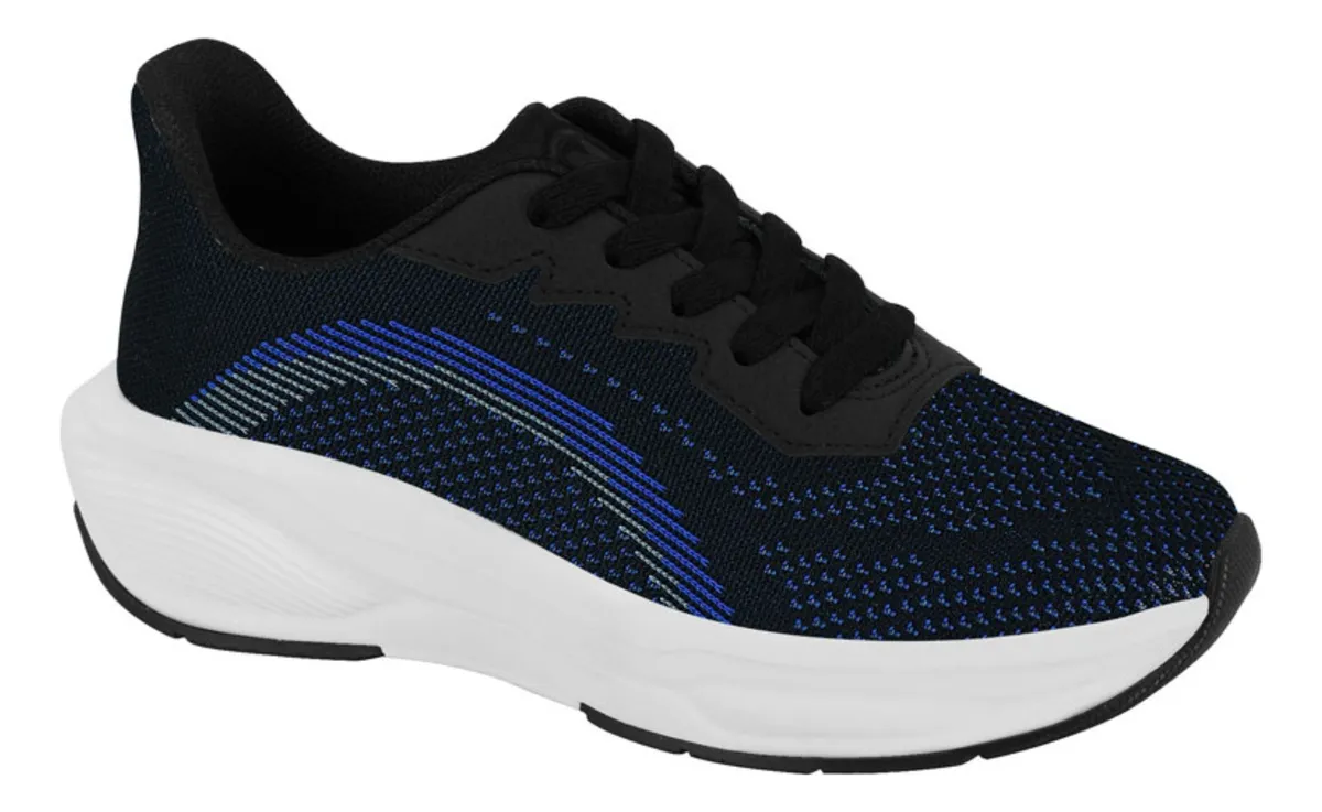Com visual esportivo em preto com detalhes azuis, o modelo combina facilmente com diferentes looks casuais. A construção têxtil com reforços sintéticos oferece durabilidade e fácil limpeza, enquanto o forro têxtil ajuda a manter o conforto mesmo em uso prolongado. O solado leve em EVA apresenta boa tração em superfícies urbanas, completando um tênis versátil para a rotina infantil.